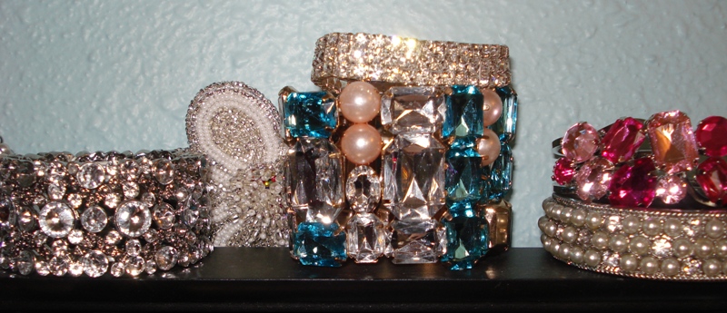 We displayed blingy bracelets on a shelf . It doesn't matter the "color" of your bedroom decor. The reflective quality of the bling makes it coordinate with everything!