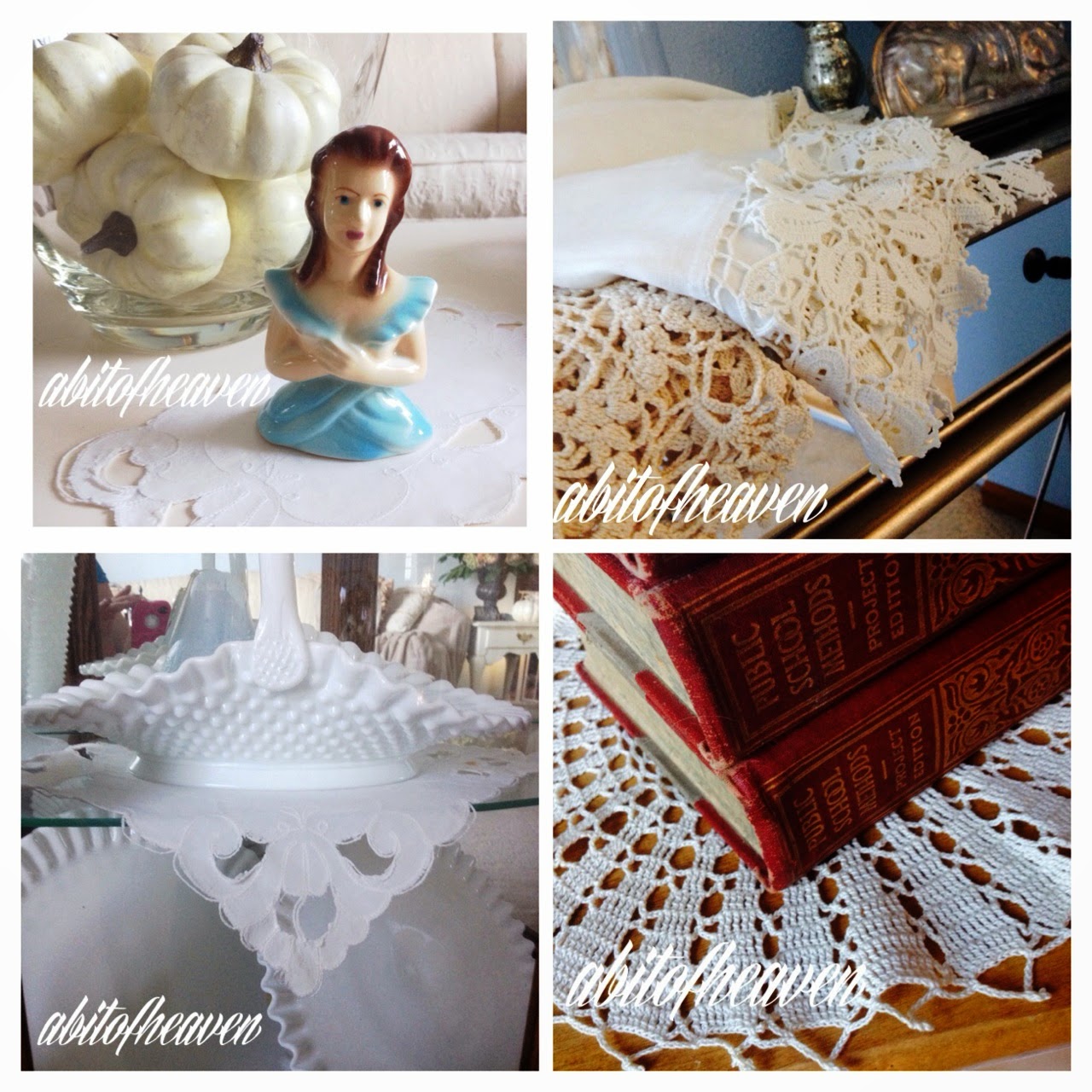 It's everywhere. Lace adds texture, warmth, and a layer of depth. It pretends to be the background of the canvas introducing the focal point, but it really is the star of the show. A little lace around my home, paired with vintage items, directs your eye to the object and then back to the lace again.