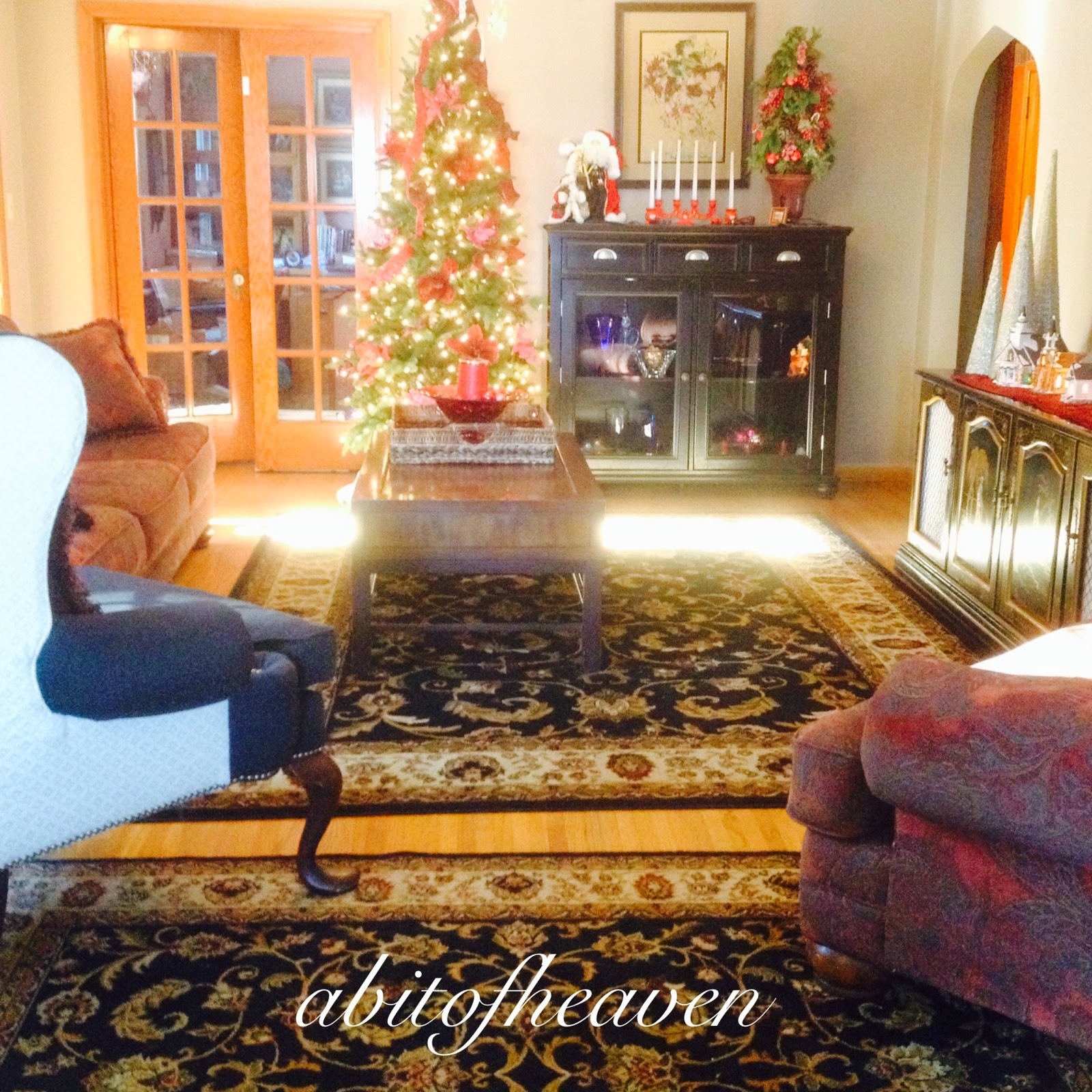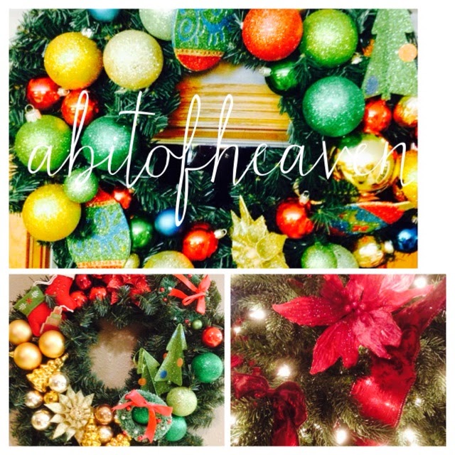 If you're wondering how I made this, I used a spool of holiday ribbon (30ft. but didn't use all of it), and wrapped it around a white dense stryofoam wreath (not the green type). I secured the very last end ribbon with a decorative pearl pin, (in the back). Another ribbon piece acts like a hanger, (also secured with a pearl pin). Broaches were attached with their pinback stuck straight into the foam. A few pearl pins were used to further secure the broaches.