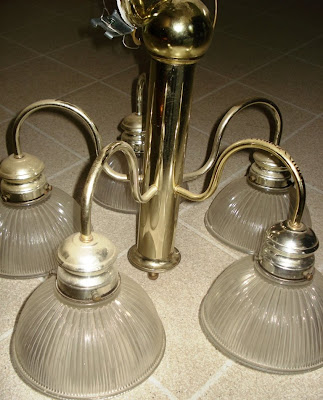 The chandelier with it's shiny brass finish and clear ribbed glass globes was purchased by me, (while wearing stretchy turquoise stirrup pants, and a glittery gold, turquoise, and orange flowered over- sized T-shirt). The little somethin' somethin' that put the spring in my step and gave me confidence to buy this piece of reflective goodness? Matching turquoise flat shoes. Can we say 1980's? Ouch.