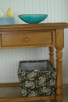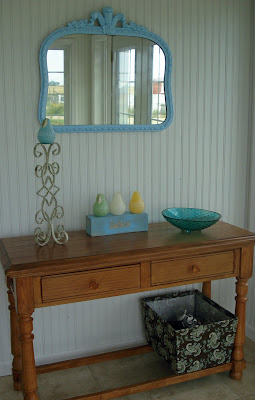 Beadboard on the walls, a fabric basket to hold stray shoes, luscious pear candles, an art glass bowl for keys, and a sky blue mirror were all put in place. The mirror is a vintage find repurposed with spray paint.