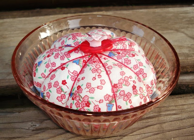 A pink depression bowl and a pin keep (made by me) also made their way into her package.
