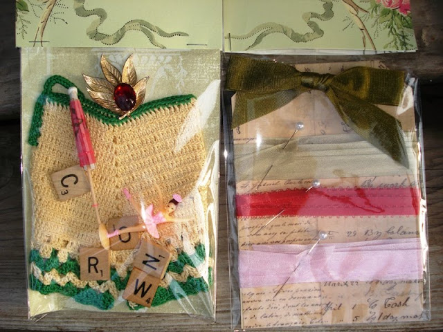I put together packages that included a plastic ballerina, scrabble letters that spell crown, a vintage bloomer pot holder, a vintage red stone pin, yards of seam binding, ephemera, horse tags (my partner lives on a horse ranch), and a little vintage wallpaper.