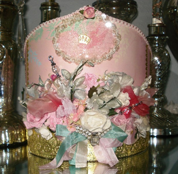 Swapping art work with fellow artists always gives me an excuse to spend time in my studio. It provided some much needed relaxation time. I wanted to provide my partner with a crown that had bits of color; pink, red, and shades of green. I also wanted the crown to have a vintage/classy feel. The millinery flowers, vintage rhinestones, and German gold embellishments aid in this look.