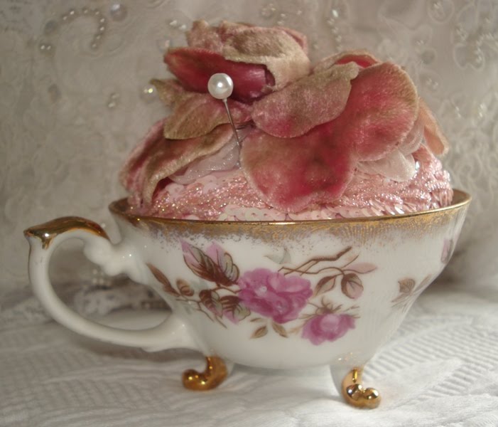 Hello Ele, how pretty everything is. I especially loved the teacup pincushion. I just love pincushions! Very pretty roses with a velvet look to them. Love them. Thanks for sharing all your fabulous ideas!