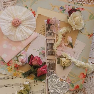 The kit contained vintage wallpaper, copies of ephemera, paper roses, sheet music, a glittered heart, and pink dotted fabric.
