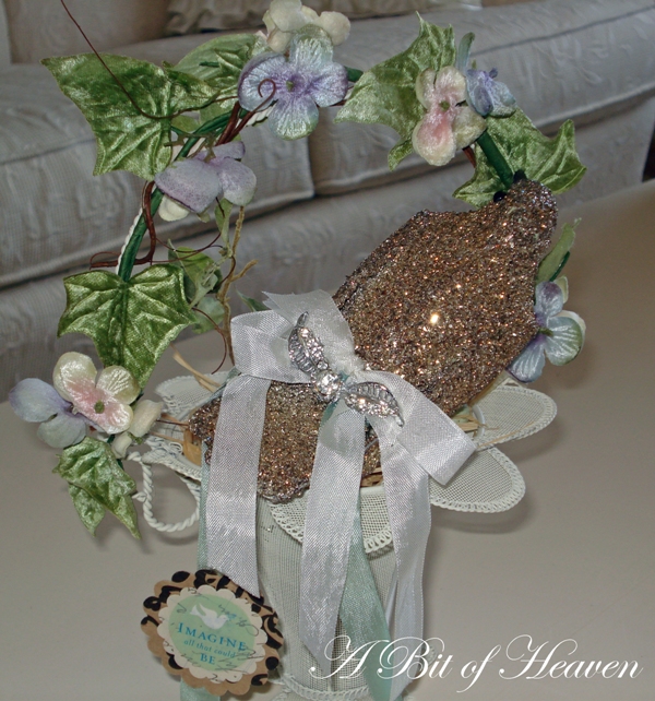 I layered a bird nest on top of seashells. The silver glittered bird is actually a Christmas tree ornament that I embellished with a jewel and seam binding.