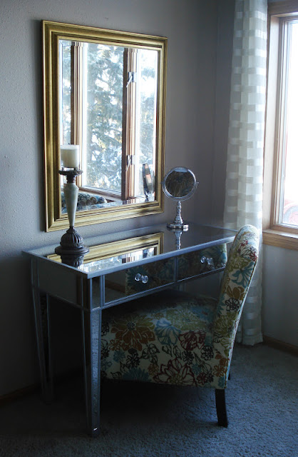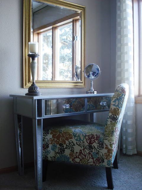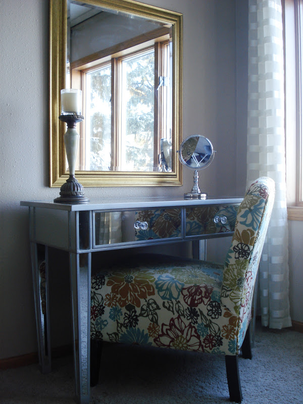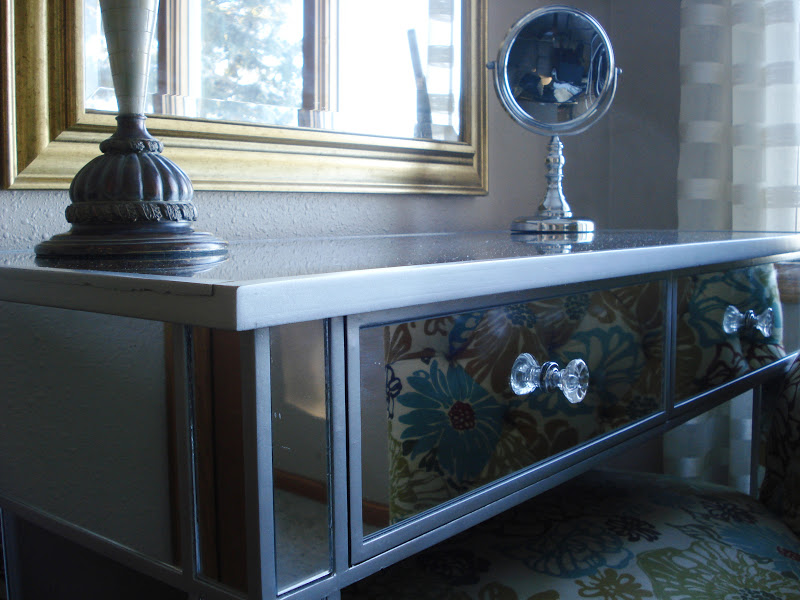 The vanity table is in my bedroom, (going to sew a chair cover, and possibly get a different mirror). The mirrored chest is in my dining room.