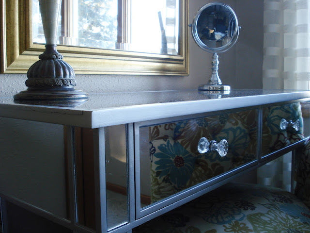 I have this "thing" for mirrored furniture. Shiney, and pretty, and happy, and ooooh so very shiney. The reflective surface says, "buy me, I want to come home with you." What's a girl to do?
