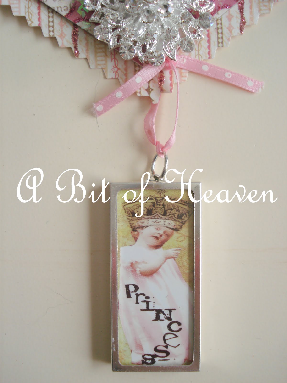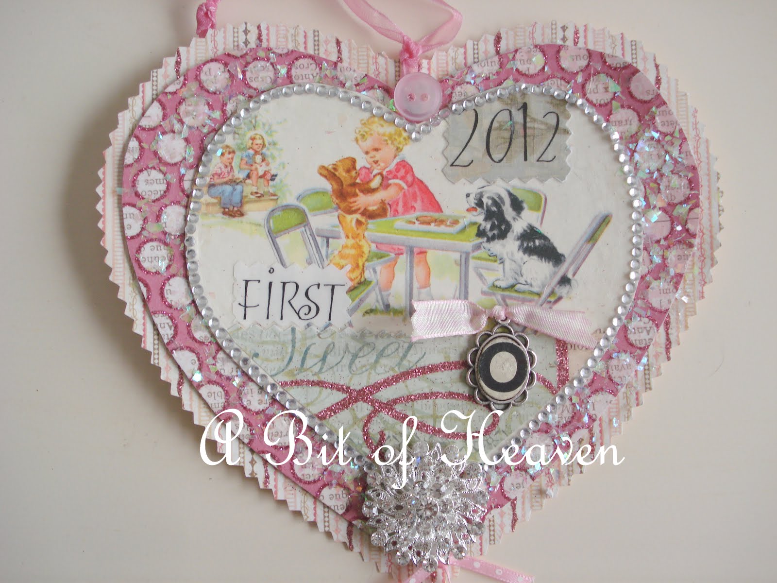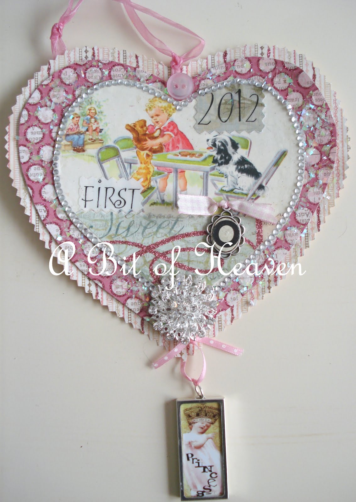 2012 was year she was born and experienced her first Christmas. Again, I used mixed media; ephemera from an old Dick and Jane book, an O positioned in a charm for Olivia, rhinestones, glitter, pretty papers, and more charms all for princess Olivia.