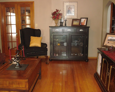 This was achieved by taking away the antique buffet and adding a higher black curio so the eye has a place to rest. Do-dads, plates, and some pictures removed. The picture of my three kids on the wall stays. They are the heart of my home. I also moved the Kennedy rocker and added the black and white chair. A coffee table was added . You know I'm not matchy matchy, so I added a coffee table that is different then the curio. It works because the wood grain top coordinates with the floor and the black legs coordinate with the curio. The antique Chinese buffet was moved to the opposite wall. The area rug with thehideous country nice blue border was removed, and has new life in my son's basement.