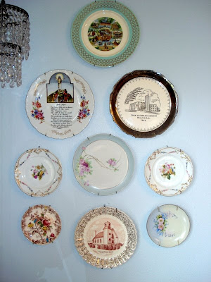 ...vintage china plates from three grandmothers, a plate from the church where Mr. Pink Heaven and I were married (27 years ago), a few plates from friends, and a plate from the church I attended as a child, with my grandmother.