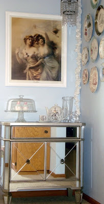 A new mirrored dresser graces the corner, (yes, I said new), and a vintage picture gets a new coat of white paint.
