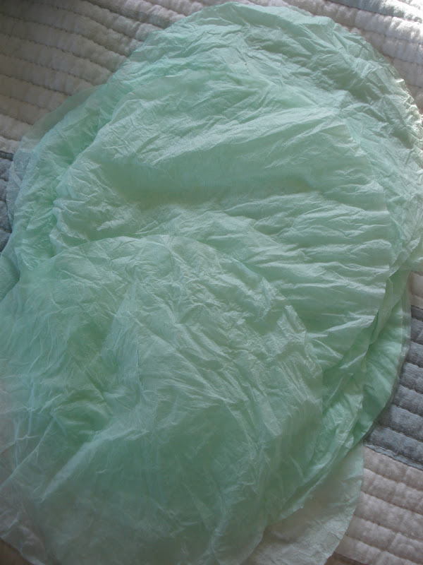 For the next flower layer, I used a coffee filter. I decided to dye them green. I put a stack of filters (abt.25) into a glass bowl, added a few drops of food coloring, and a couple of tablespoons of water. I waited a a minute or two, drained the water, and squeezed the remaining moisture out of the filters with my hands. Then, I dabbed the stack with a paper towel, to remove any remaining moisture.