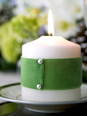 Craft Tip: Tack a ribbon to a candle by using upholstery tacks, or a short pin. Gently tap the tack through the ribbon, into the candle with a hammer. This same idea can be done with a strip of paper or fabric. Make sure you keep the decor far from the flame!