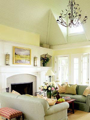 Soft green and yellow will provide a soothing palate. A dramatic pop of red fabric on the stool behind the couch, brings interest to this room.