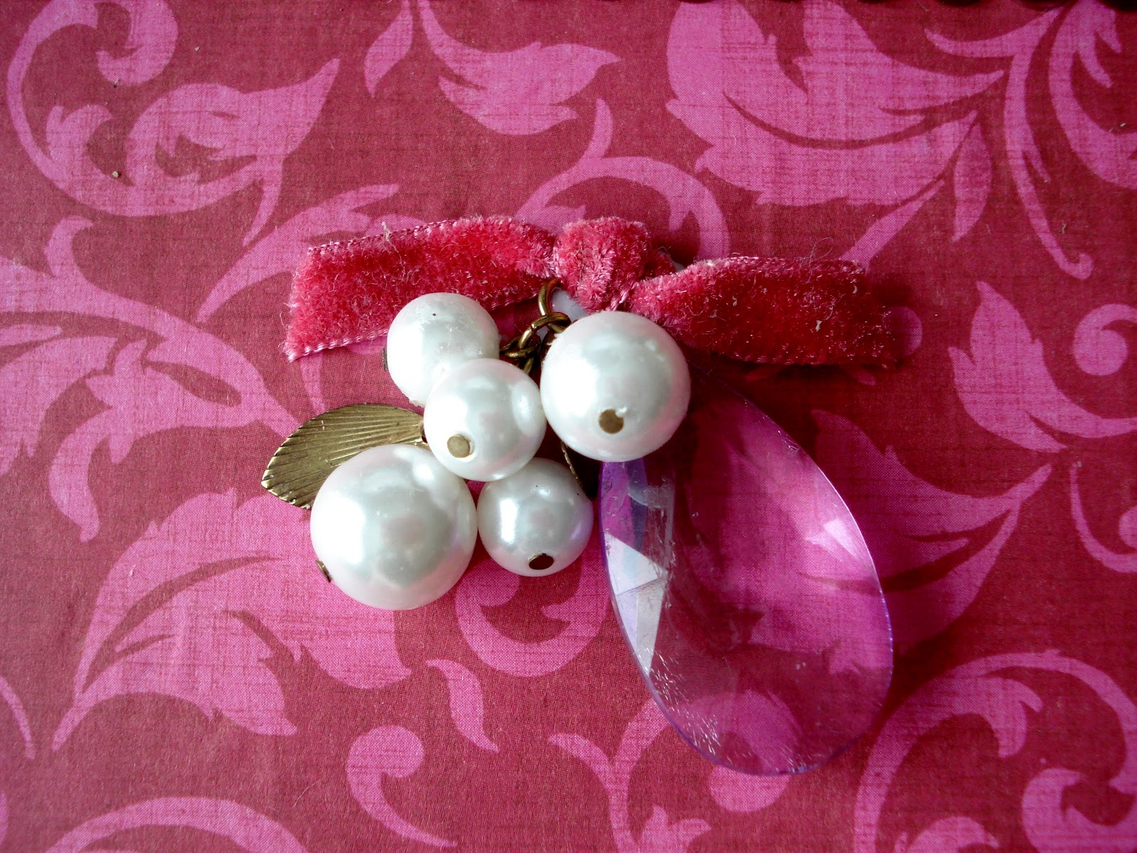 Next, dip into your old, hardly every used jewelry, or take a trip to the second hand store and find an accent piece for your gift bag. Repurposing old jewelry will literally cost quarters. I chose a lavender colored drop, and some faux pearls, added them to a snippet of velvet ribbon, and glued it on.