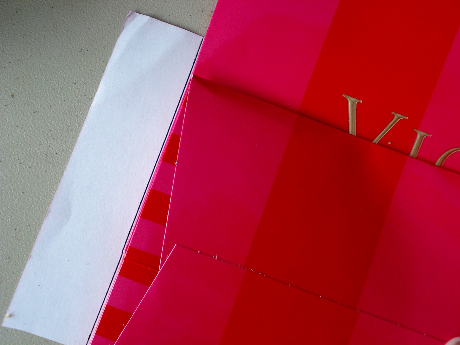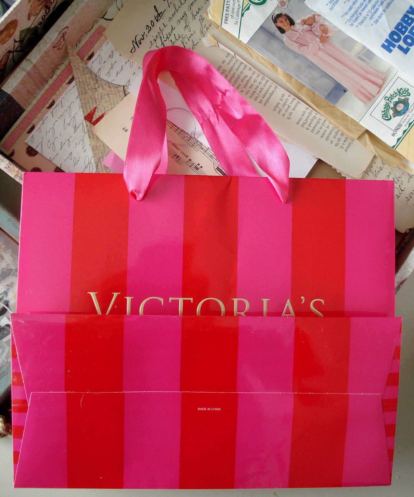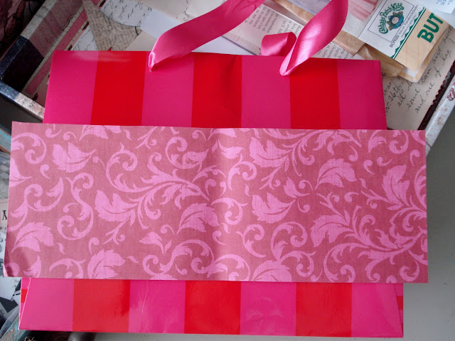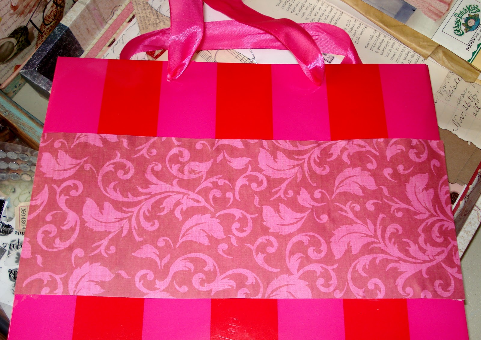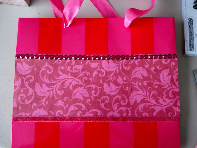 Don't throw away shopping bags just because they have the store name on them. Repurpose and Reuse! This bag has great colors of Red and Hot Pink. I picked out scrapbook paper that had similar shades, only a different design. I like to pair a large print (stripe), with a smaller print.