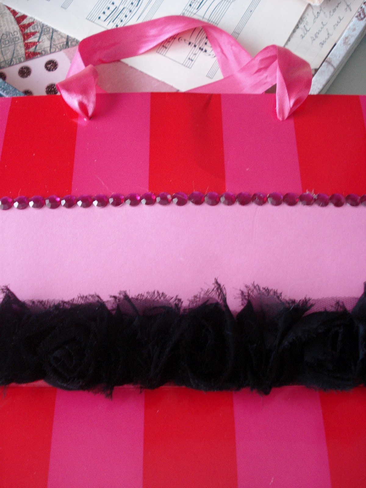 I chose a strip of hot pink rhinestone stickers, and rose colored velvet ribbon. Just about anything can be glued down, except satin ribbon, as the glue will show through.