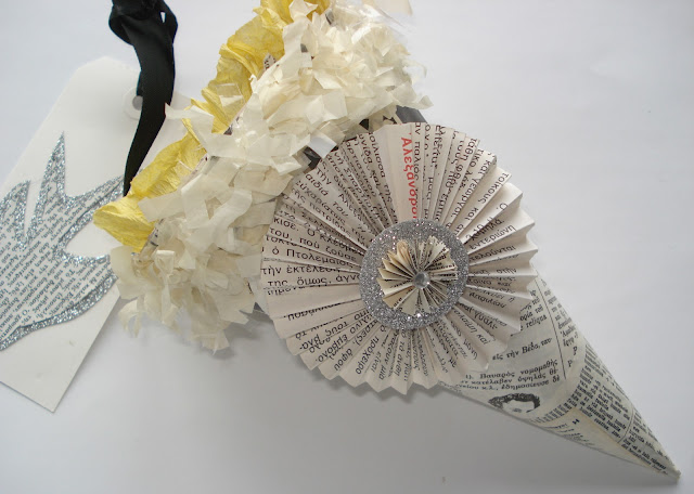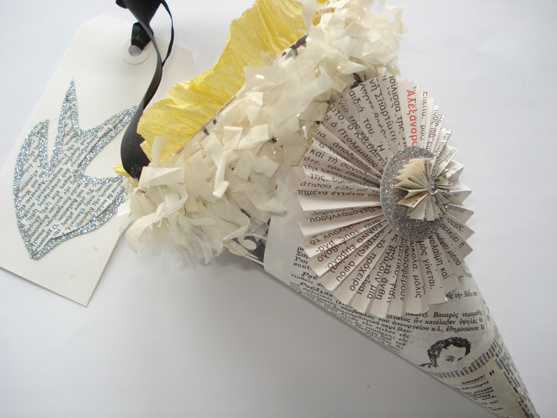 A little unexpected is the red lettering, and the pale yellow crepe paper.