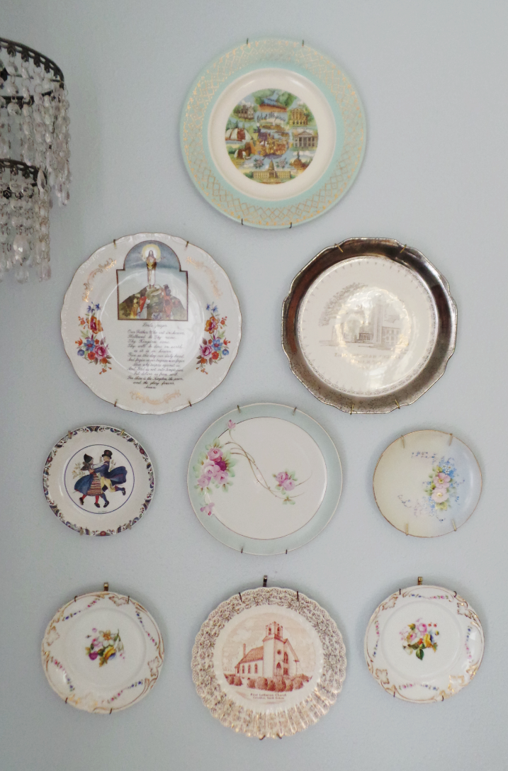 A gallery wall of plates adds a little variation to the traditional "picture" gallery wall. I do say, I love my vintage plates. Some were gifts, a few were special "finds" while others hold memories of relatives.