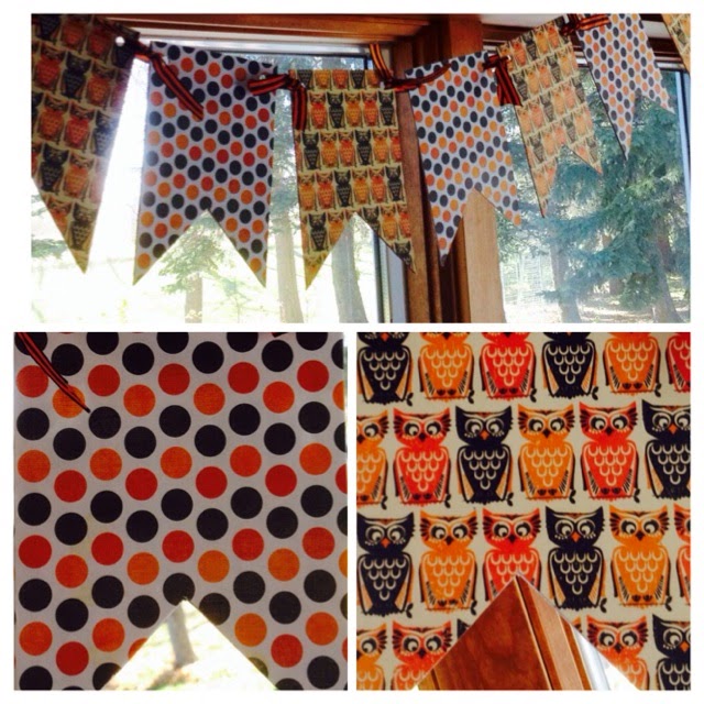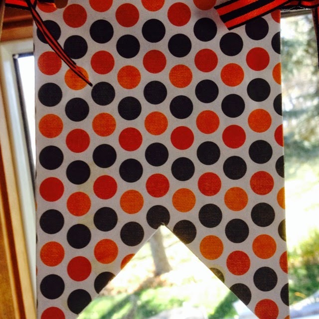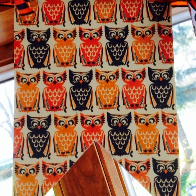 Polka dots and owls, in Fall shades of oranges and browns hangs on my kitchen window.