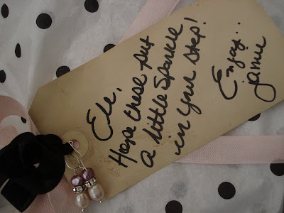 So, imagine my excitement when I found out that I won her giveaway. Look how Jamie wrapped the package; pink and black seam binding, an aged tag, AND A PAIR OF EARRINGS!