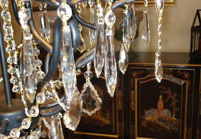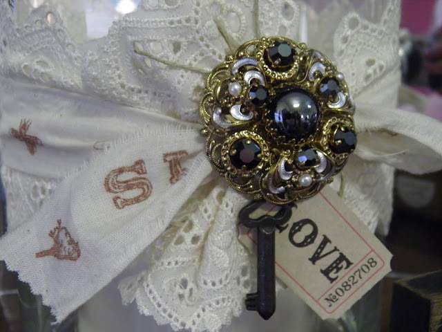 The ribbon is the perfect marriage of shabby and elegance. I tied it around a large glass cylinder, added a little vintage bling, a little love, and some sumptuous "I will be sad when I use it all" lace.