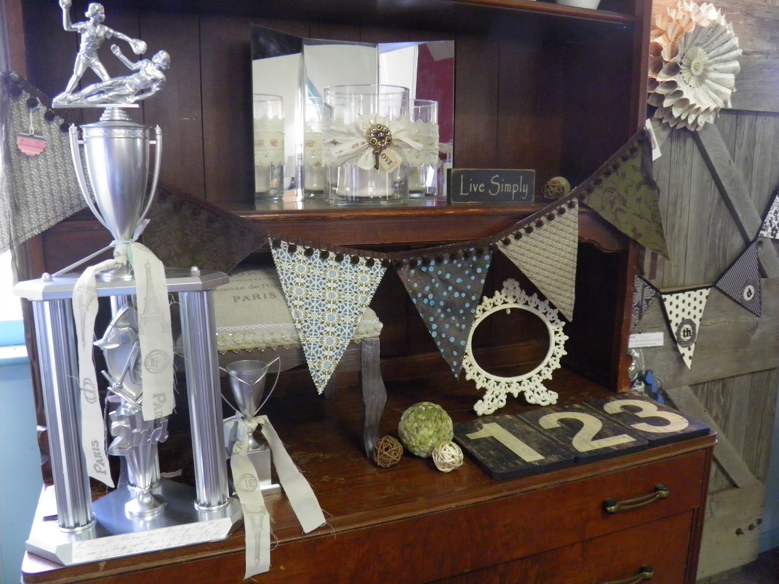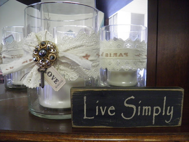 Inside, a vanilla candle is ready to be lit. I made quite a few of these, but were sold at my last craft show. I also used the ribbon to gussy up some old trophies. This picture was taken in my shop.