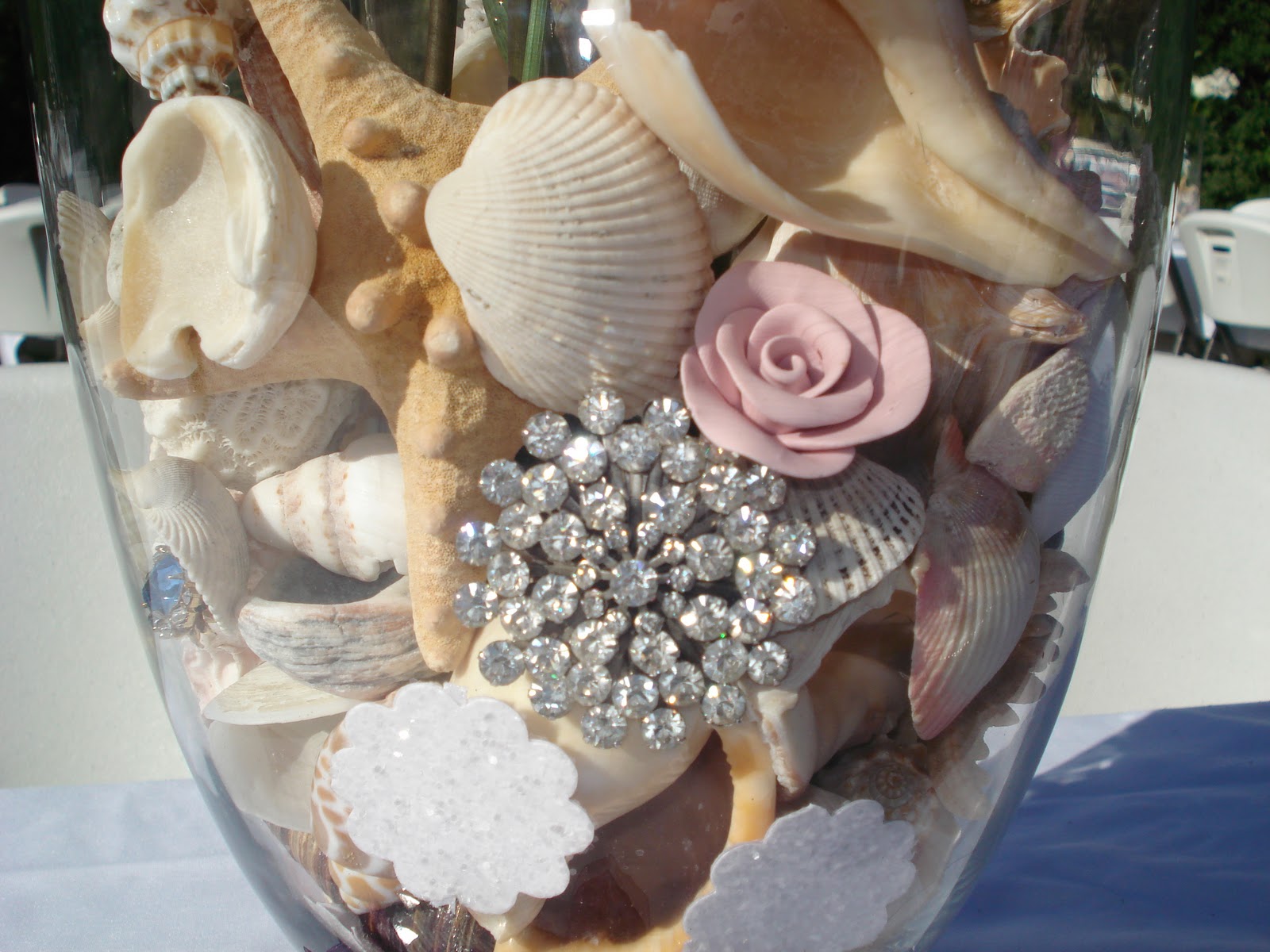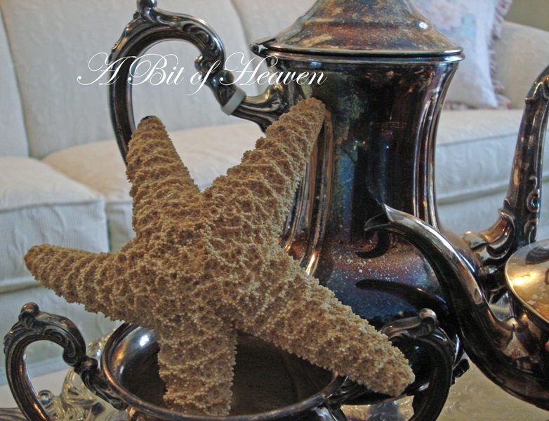 To glitter starfish use spray adhesive and shake on silver glitter or glass glitter. Use a glitter tray from a craftstore. It will save you frustration and glitter!