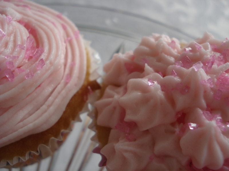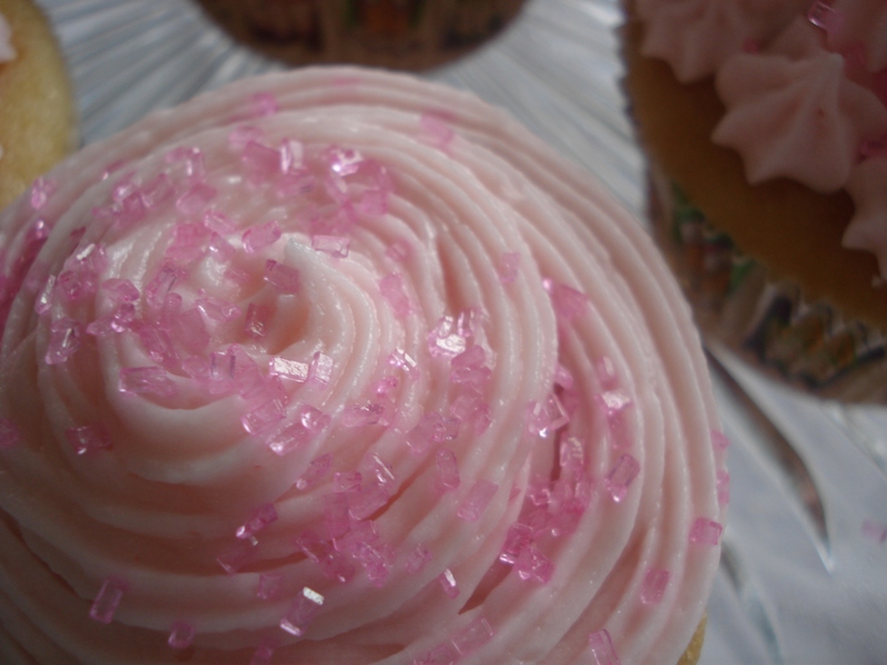 Pink sugar sprinkles dance on swirled frosting.