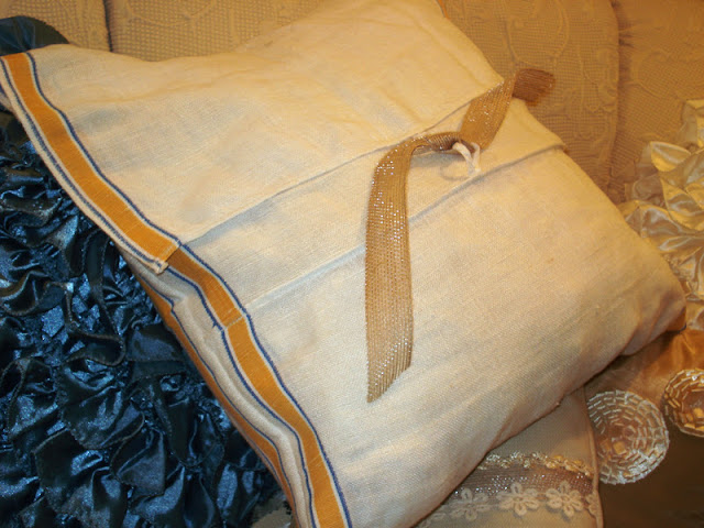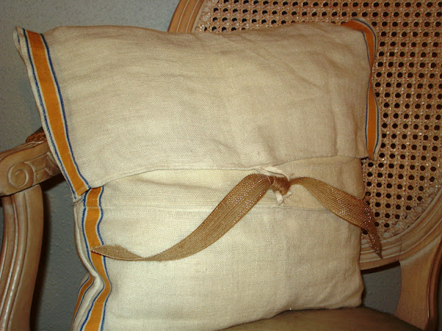 Two blue and yellow striped vintage dish towels have been recycled, upcycled, and remade into a comfy pillow.