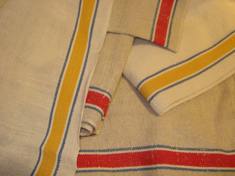 When the snow starts swirling around outside, my sewing matching starts calling, "come play with me!" So play, I did. I had a stack of vintage dishtowels with lovely stripes down the side, (remember in a past post my son bought them and was going to use them for oil rags in the shop. NO!).