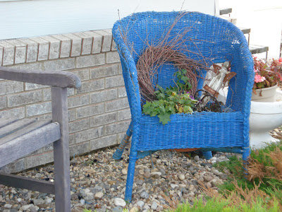 An old wicker chair lost it's seat, so I positioned a pot inside that is planted with ivy. We have had so much rain that the ivy started to turn yellow:(