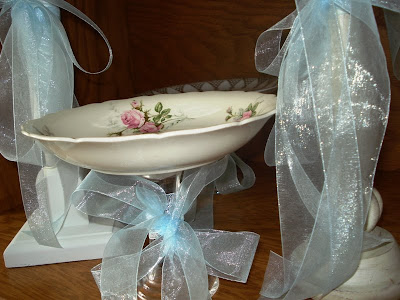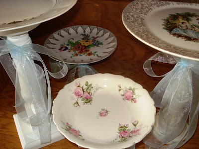 CRAFT TIP: While visiting blogs the other day, I found that "Organize and Decorate Everything" had a tutorial on this very same project!  Visit her Desert Stand post for a detailed how to.  She made great looking stands with new plates. The all white plates give the grouping a sense of unity, but the use of different plates and candleholders add a wonderful interesting mismatched feel.