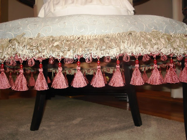 I chose a trim with tassles for the bottom layer.  I stapled right on top of the trim to adhere it to the chair. I love the way the tassles hang.