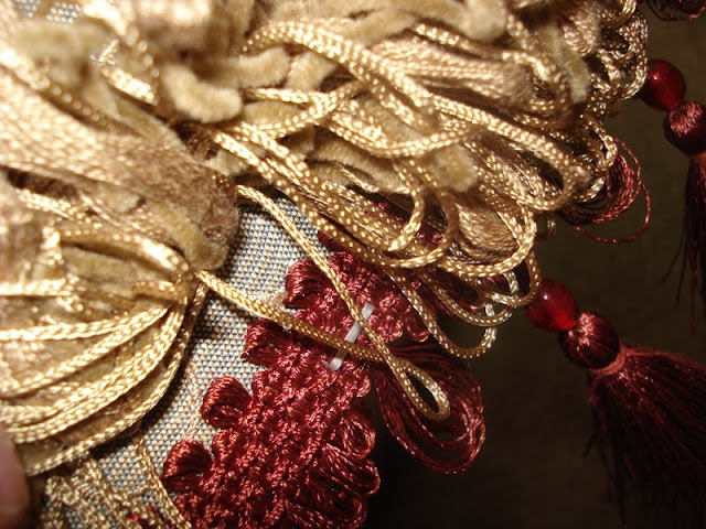 The top layer of trim, which consisted of thick beige loops of chenille and satin was placed so that the loops covered the staples of the bottom trim. The top trim was secured with upholstery tacs.